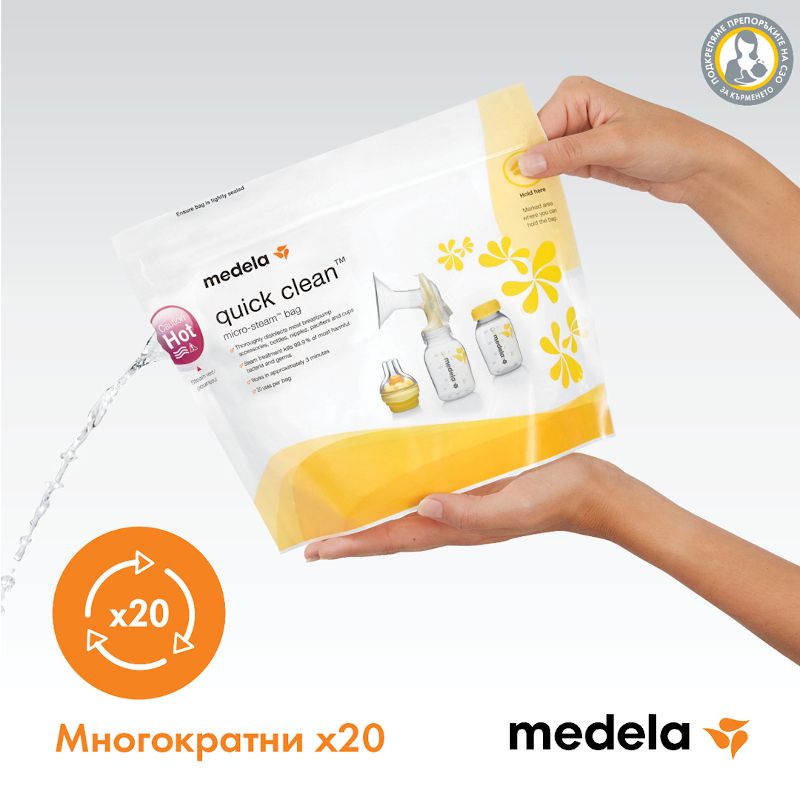 Уникалните, многократни пликчета за стерилизиране в микровълнова фурна Quick Clean елеминират 99,9% от всички вредни бактерии и микроби от повечето части на помпата за кърма и аксесоарите за хранене. Можете да извършвате ежедневната стерилизация за 3 минути благодарение на тези лесни за употреба пликчета с микро пара. По-бързо от преваряването и по-ефективни от измиването, тези пликчета спестяват реално време за майките. Просто добавете вода и сложете в микровълновата фурна. Всяко пликче може да се използва до 20 пъти.